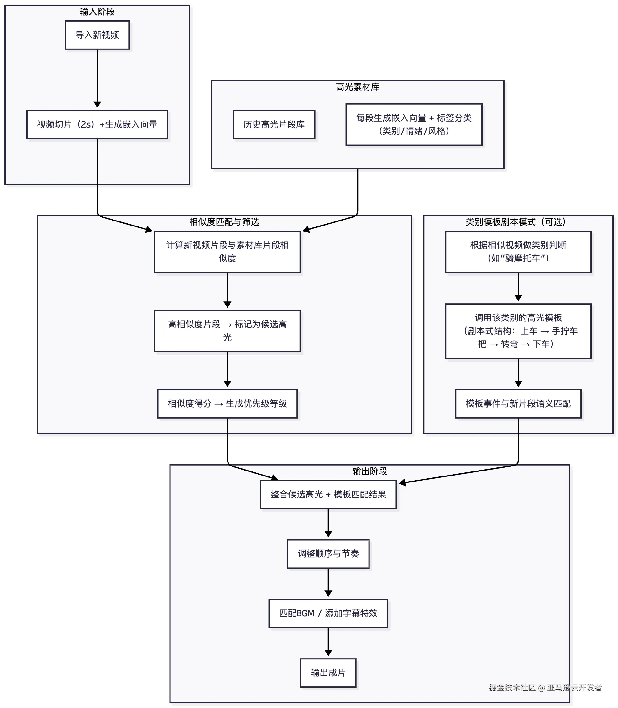 - 方案架构与案例代码(2.1 基础:高光压缩; 2.2 跨视频内容驱动的高光剪辑; 2.3 历史素材驱动的模板化高光生成)
