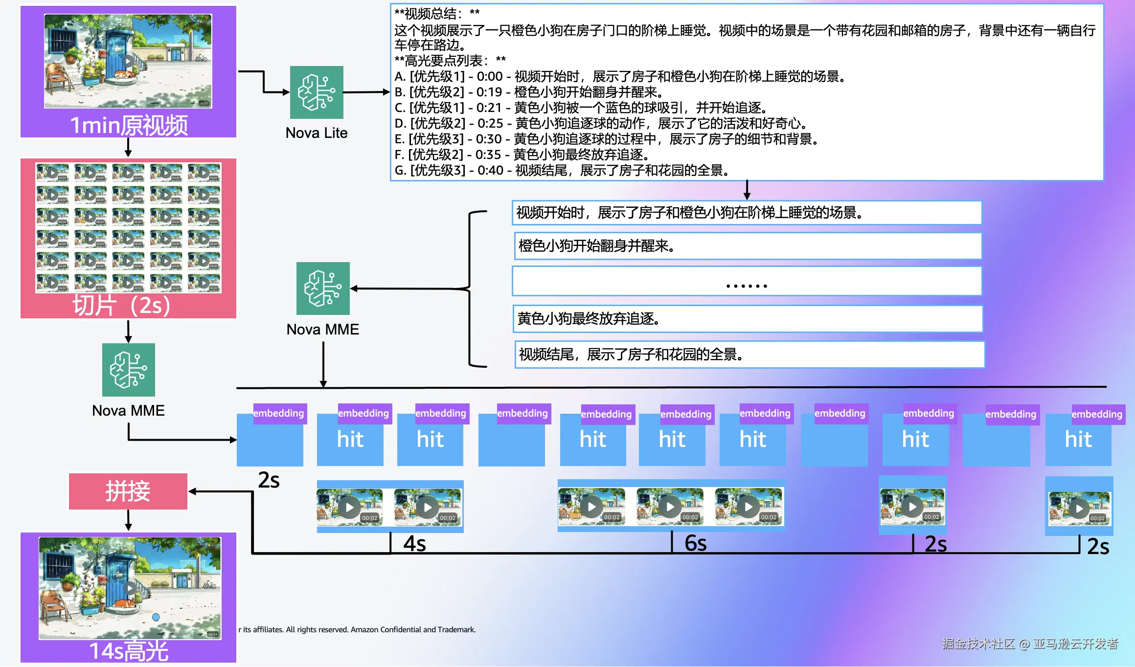在本文方案中,我们将使用Nova MME的视频嵌入生成能力,通过语义相似度检索片段嵌入,以此定位高光片段。