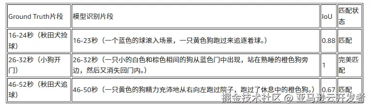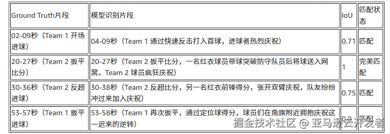 为了量化评估模型的表现,我们使用IoU (Intersection over Union) 指标将模型输出与人工标注的Ground Truth进行对比。IoU衡量预测片段与真实片段的重叠程度,当IoU > 0.5时视为成功匹配。测试结果如下 :