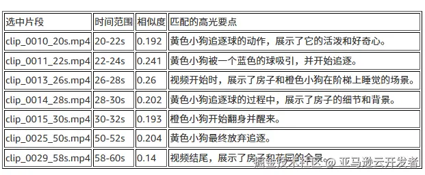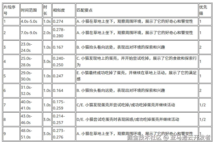 接下来进行的2~4步的处理,以1s为间隔对视频进行抽帧,对高光要点与抽帧后的图片进行嵌入生成与语义匹配,最后根据抽帧间隔与帧起始时间合并连续片段。最终提取出9个连续的高光片段(总时长16秒)如下表所示: