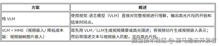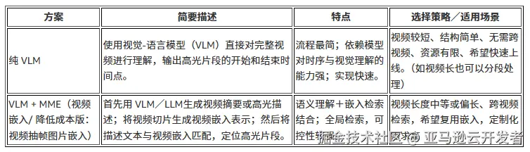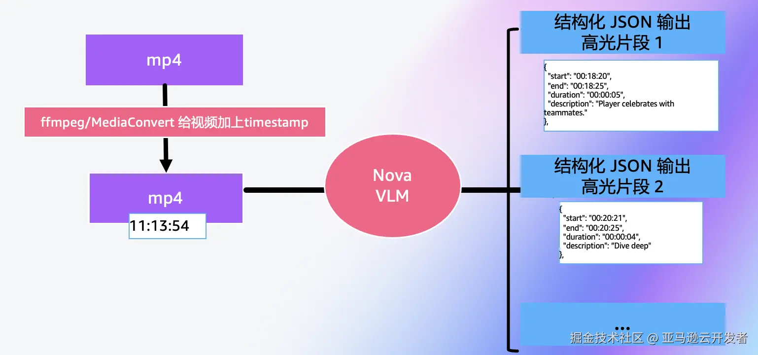 纯VLM方案的核心思路是:直接让Nova模型读取整个视频,理解其内容后输出高光片段的时间戳(开始时间和结束时间),然后使用FFmpeg等工具按时间戳切分并拼接视频 。