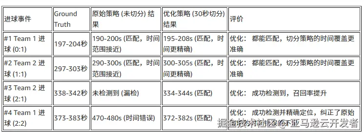 以一段1分钟的足球比赛视频(视频来源)为例,我们使用Nova Lite模型自动识别进球等精彩时刻。原始视频包含完整的比赛片段,其中穿插了多个进球瞬间、精彩扑救和关键传球。通过纯VLM方案,模型能够自动定位这些高光时刻并生成浓缩版视频。