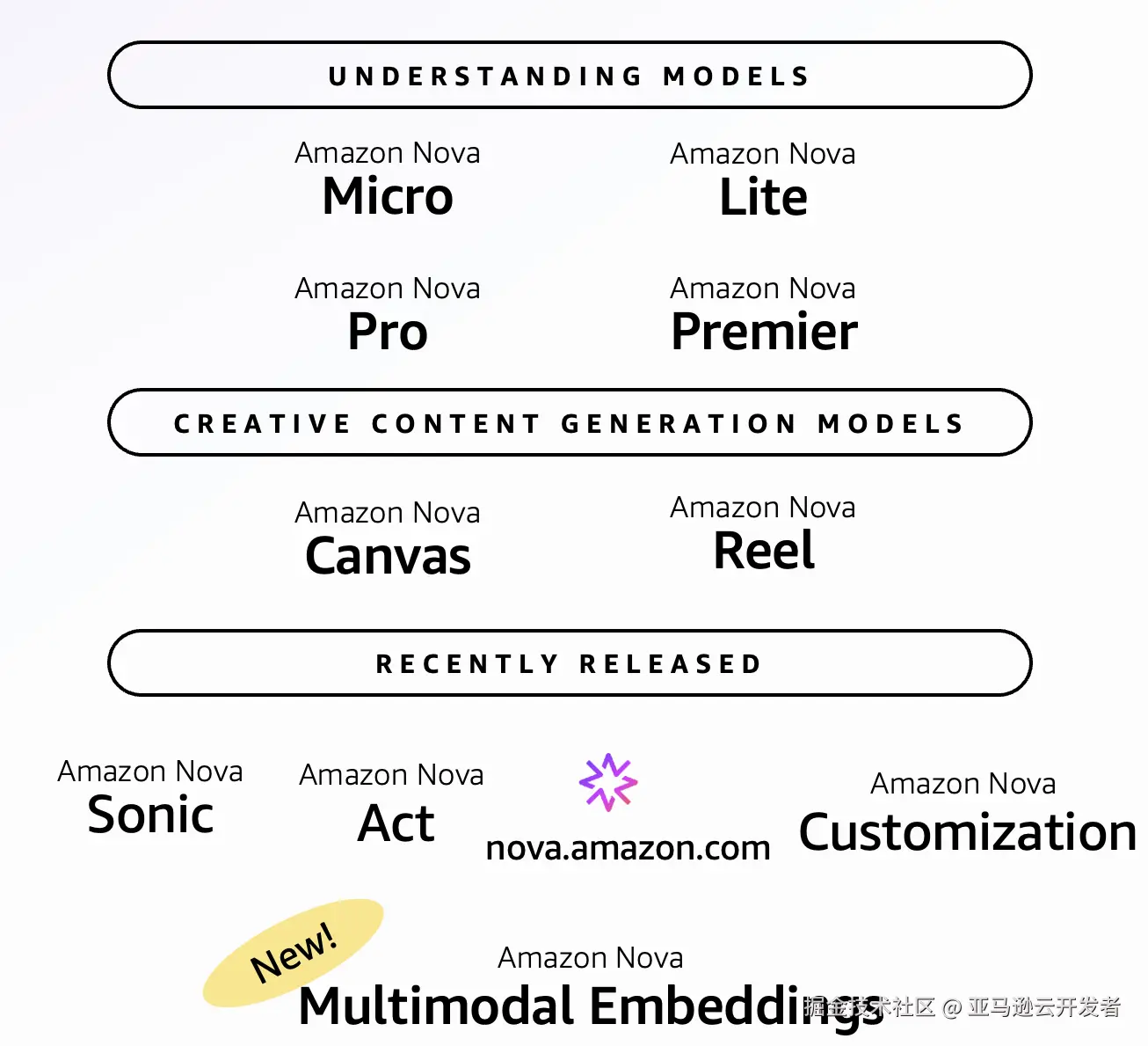 Amazon Web Services(Amazon)推出的 Amazon Nova 自研模型系列,是一组基础模型(foundation models),覆盖文本、图像、视频、语音和智能代理等多模态输入与输出,旨在为企业构建生成式 AI 应用提供性能优越、成本更低、可定制性更强的选择。现已在 Amazon Bedrock 上提供。更多模型全系列信息:aws.amazon.com/nova/