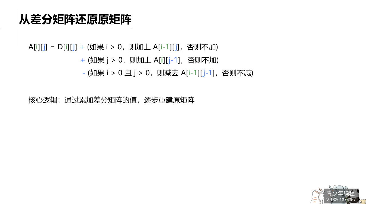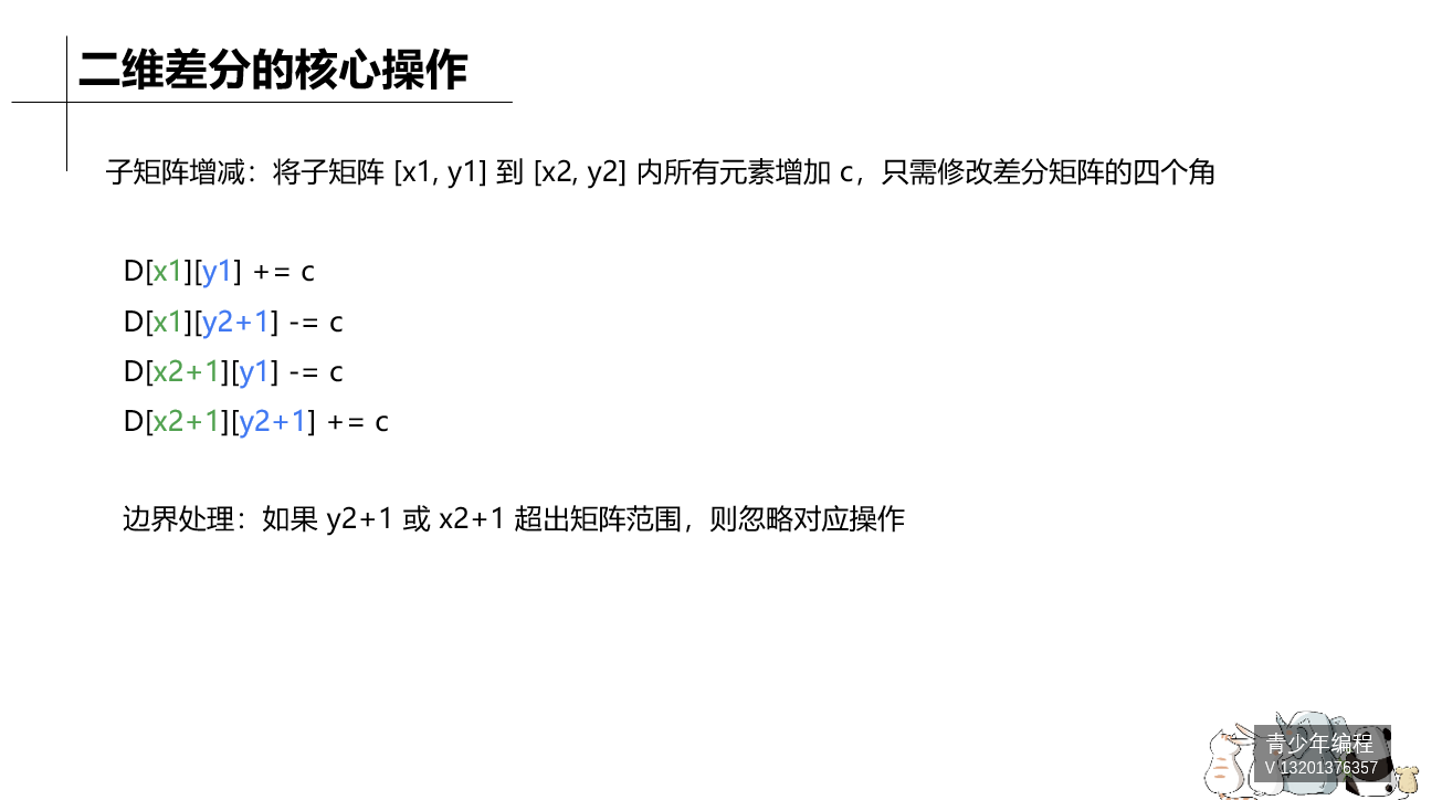 能理解一维的,二维应该也差不多,就是把一维的扩展到了二维而已,和一维一样,如果想要改变一整个区间(到了二维就应该是矩阵)的所有变量,只需要改变头尾(四个角)的值就可以了