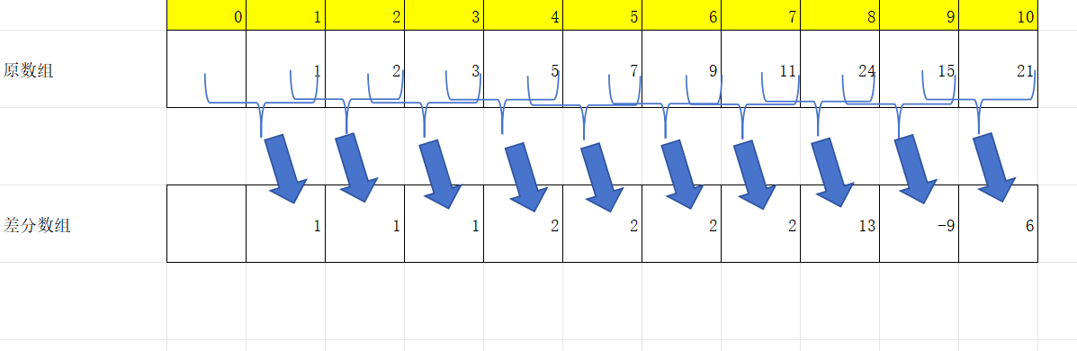 如你所见,差分数组就是表示原数组中相邻数差值的数组,通常只需要给出第一个元素就可以依靠差分数组推出整个原数组。
