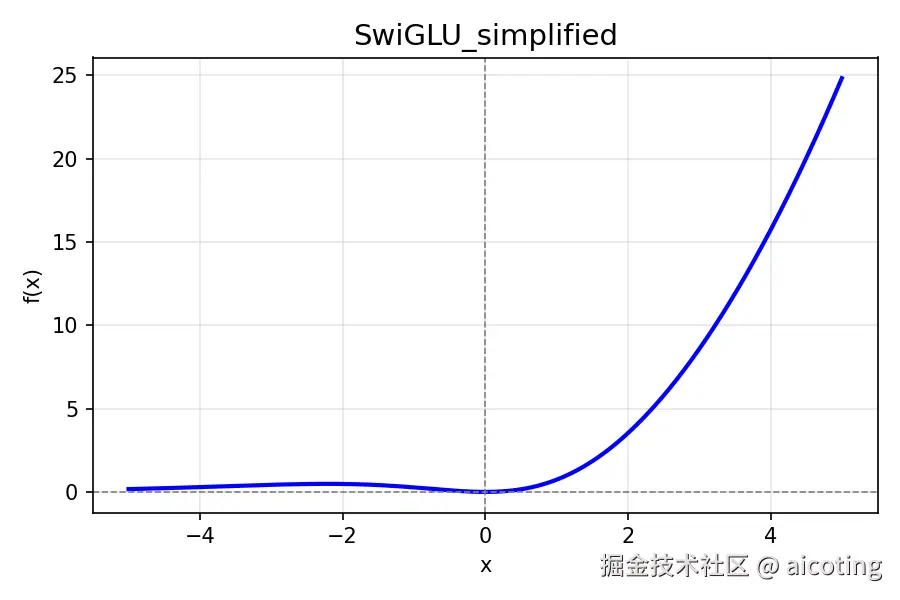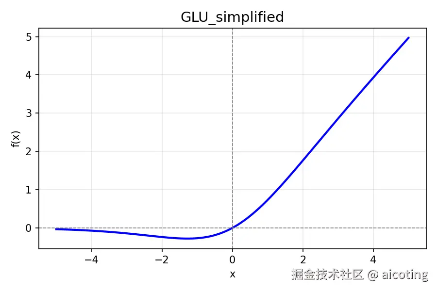 GLU/SwiGLU 在实际中是门控形式(two linear branches),是向量上的逐元素操作;为了在一维上可视化,我用简化的标量形式来画图 ------ 把两条分支都用相同的输入值(即把 a=x, b=x),因此 GLU(x) = x * sigmoid(x),SwiGLU(x) = x * SiLU(x)。这能直观展示门控机制的形状差异。