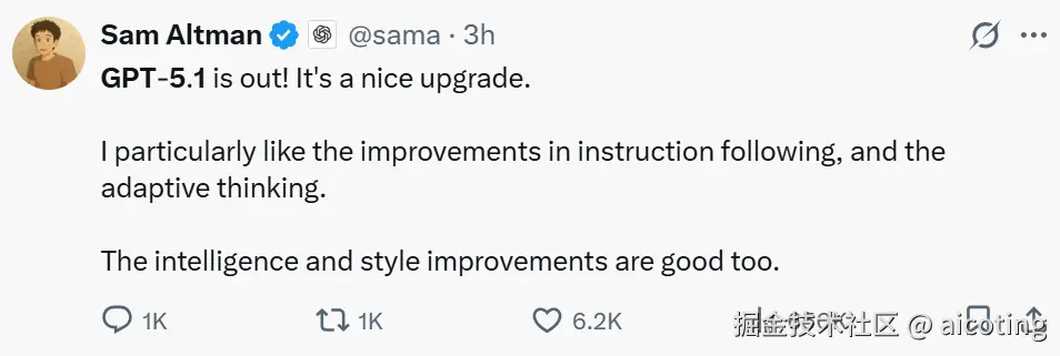 Sam Altman 在社交平台上说:这是一次不错的模型升级。