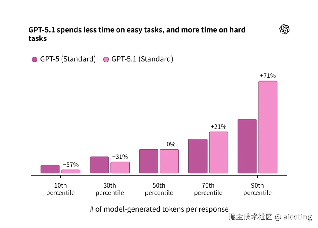 与 Instant 侧重速度不同,GPT-5.1 Thinking 是 OpenAI 面向复杂任务推出的深思型模型。它的更新重点在于推理策略的改进:根据任务难度动态分配思考时间。