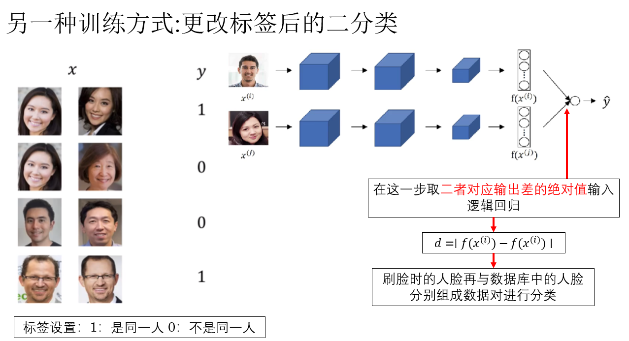 这样,我们就又把人脸识别问题又转换回了二分类问题,通过反向传播来进行训练。
