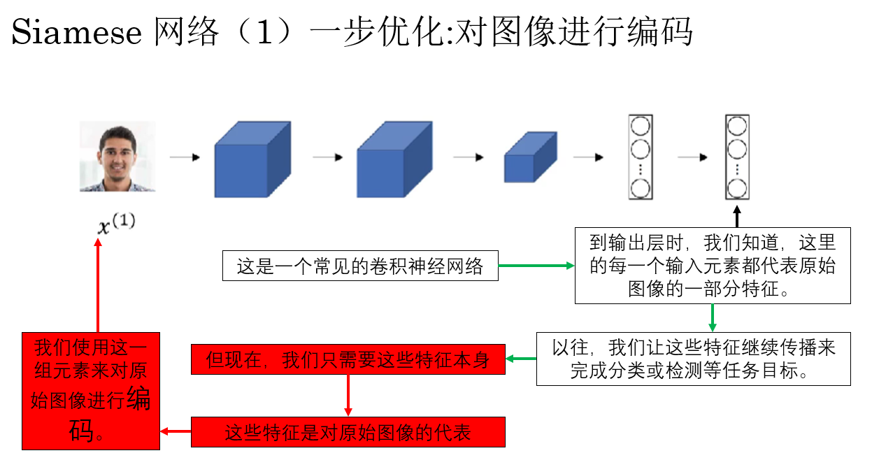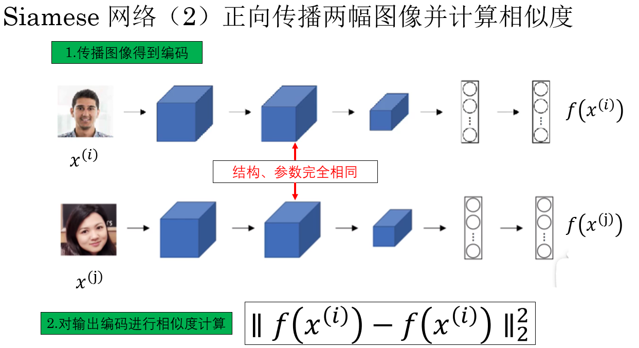 | 正向传播两图计算相似度 | 已训练网络对两幅图像编码后,计算特征距离或相似度,用阈值判断是否同一人 | 先把照片编码成"身份特征卡片",刷脸时只比对卡片 |