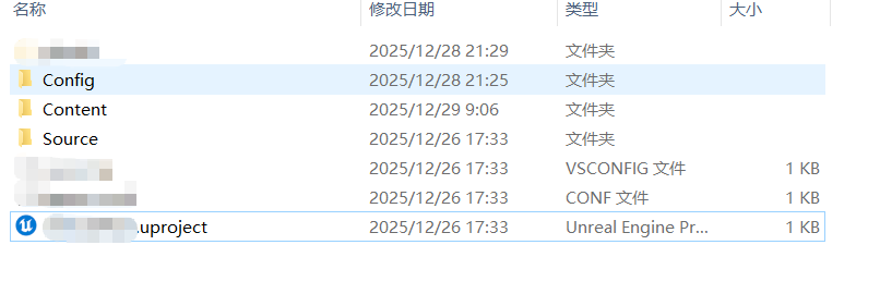 6.重新手动构建项目,也就是删除除了Content,Config和Source还有.uproject外的所有文件,并且右键.uproject先Generate再双击打开项目Rebuild。