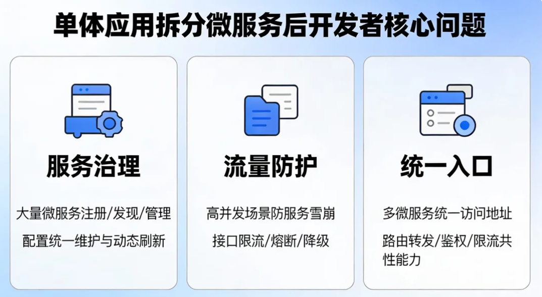 在单体应用向微服务拆分后,开发者会面临一系列核心问题: