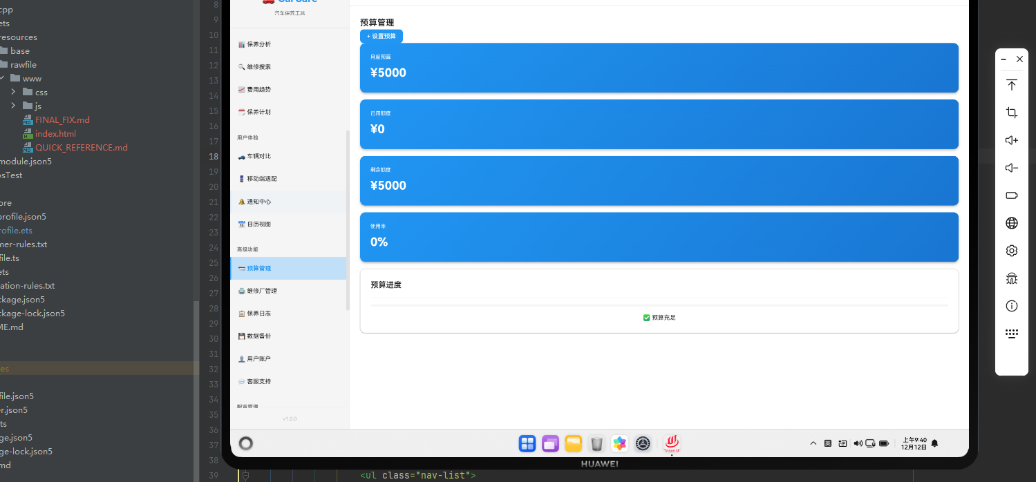 预算管理系统帮助用户控制车辆维护成本。通过设置预算和监控支出,用户可以更好地规划财务。本文将详细讲解如何在Cordova&OpenHarmony框架中实现预算管理系统。