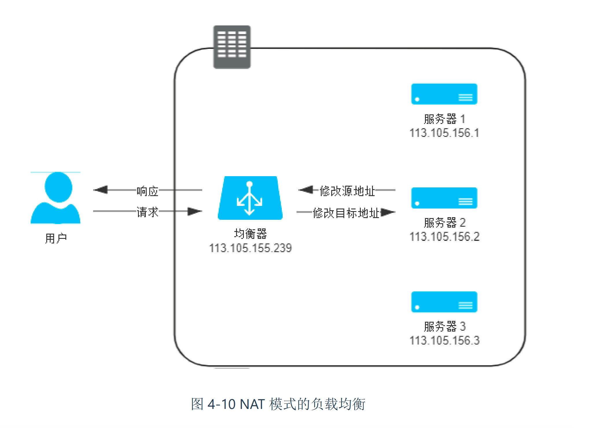还有一种是直接修改ip地址的方式。中间的负载均衡直接把目标ip改成服务的节点ip, 然后把包转发给目标节点。目标节点处理之后还要将结果转给负载均衡,负载均衡再修改返回包的目标地址(客户端)地址,这样完成一次完整的网络请求。 这种方式和NAT很相似,也叫做NAT模式的负载均衡模式。如下图