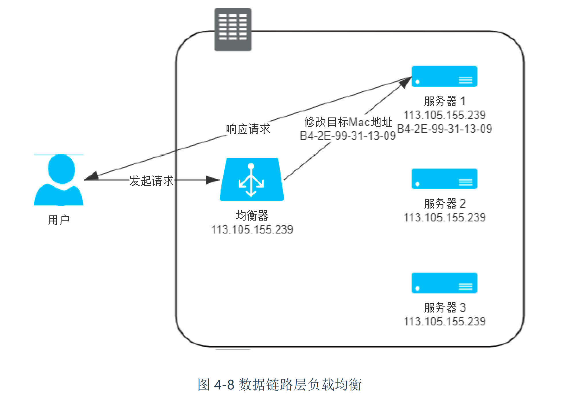 数据链路层的负载均衡主要是是修改请求的数据帧中的 MAC 目标地址,让用户原本是发送给负载均衡器的请求的数据帧,被二层交换机根据新的 MAC 目标地址转发到服务器集群中对应的服务器。 主要原理如下图所示。