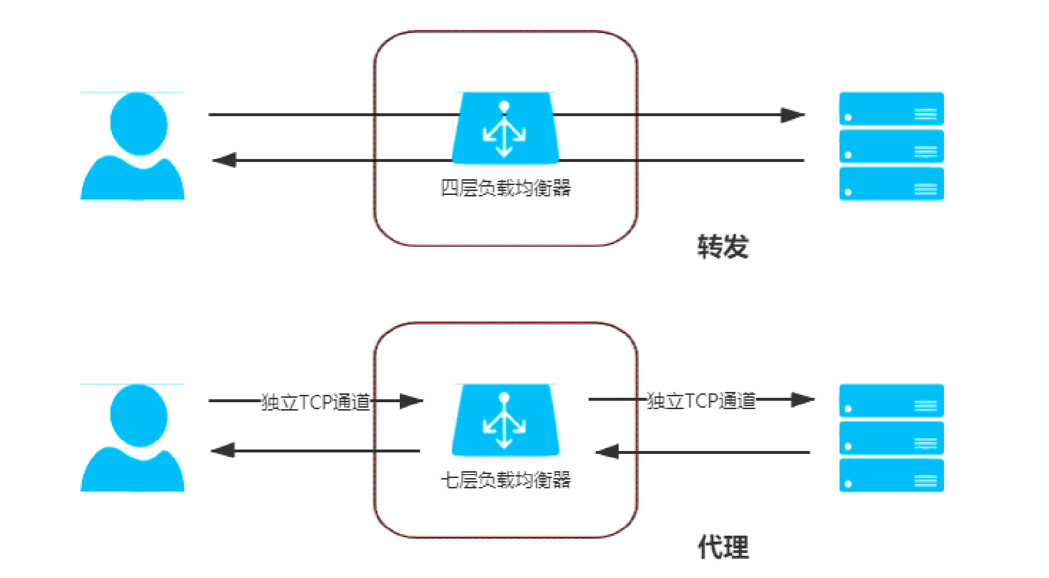 这两个概念在有些场景确实可以混用,代表了中间的这个实体(可能是负载均衡、也可能是网关)将请求发到下游 一侧。 这里作为负载均衡的两种不同类型来讨论,区别在于这个中间实体和客户端、真实的服务器建立TCP连接 。如下图所示。