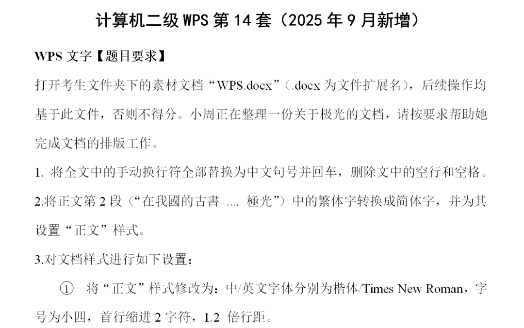 打开考生文件夹下的素材文档"WPS.docx"(.docx为文件扩展名),后续操作均基于此文件,否则不得分。小周正在整理一份关于极光的文档,请按要求帮助她完成文档的排版工作。