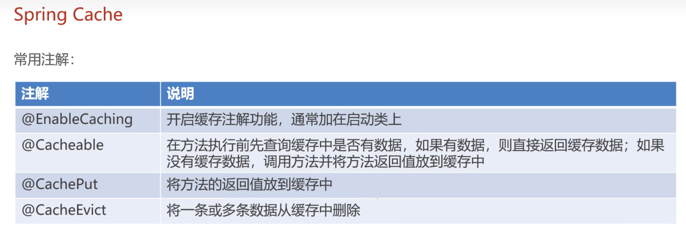 Spring Cache是一个框架,实现了基于 注解 的缓存功能,只需要简单的加一个注解,就能实现缓存功能
