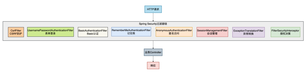当一个请求到达时,它会经过一系列安全过滤器,每个过滤器负责特定的安全功能: