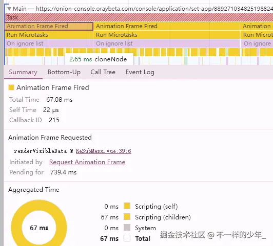 线索 : Performance 面板明确指出了凶手是 ReSubMenu.vue 里的 renderVisibleData 函数。
