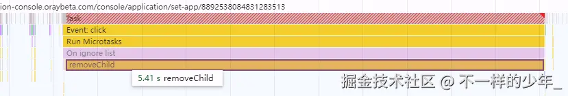 大家看这张截图,关闭弹窗的一瞬间,removeChild 操作竟然耗时 5.14s!这意味着浏览器主线程被这个巨大的"拆迁工程"彻底堵死,用户只能对着屏幕发呆。