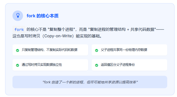 总结一下:fork的核心不是 "复制整个进程",而是 "复制进程的管理结构 + 共享代码数据"------ 这也是写时拷贝能实现的基础。
