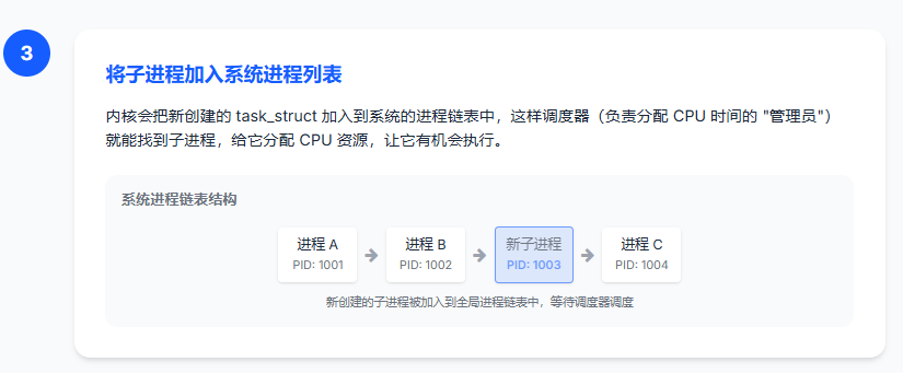 内核会把新创建的 task_struct 加入到系统的进程链表中,这样调度器(负责分配 CPU 时间的 "管理员")就能找到子进程,给它分配 CPU 资源,让它有机会执行。