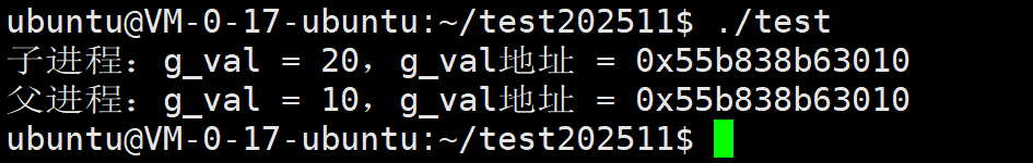 神奇的现象:父子进程打印的g_val地址完全相同,但值不同 ------ 这就是写时拷贝的功劳:地址是虚拟地址,父子进程虚拟地址相同,但映射到不同的物理地址,所以值不同。