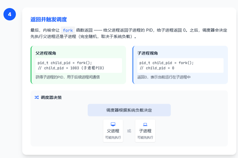 最后,内核会让fork函数返回 ------ 给父进程返回子进程的 PID,给子进程返回 0。之后,调度器会决定先执行父进程还是子进程(完全随机,取决于系统负载)。