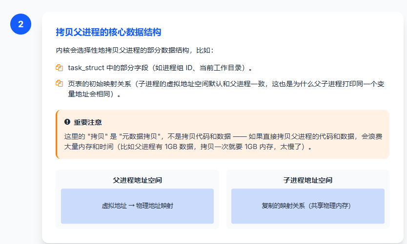注意:这里的 "拷贝" 是 "元数据拷贝",不是拷贝代码和数据 ------ 如果直接拷贝父进程的代码和数据,会浪费大量内存和时间(比如父进程有 1GB 数据,拷贝一次就要 1GB 内存,太慢了)。