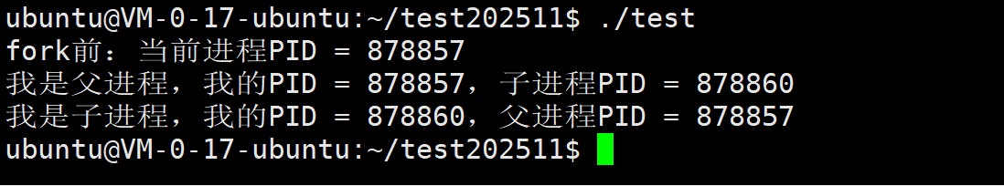 注意一个关键细节:fork前的打印只执行了 1 次,而fork后的打印执行了 2 次 ------ 这就是 "分叉" 的本质:fork调用前只有 1 个进程,调用后变成 2 个进程,分别执行fork之后的代码。