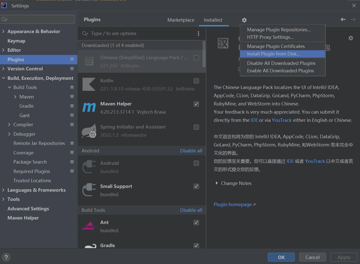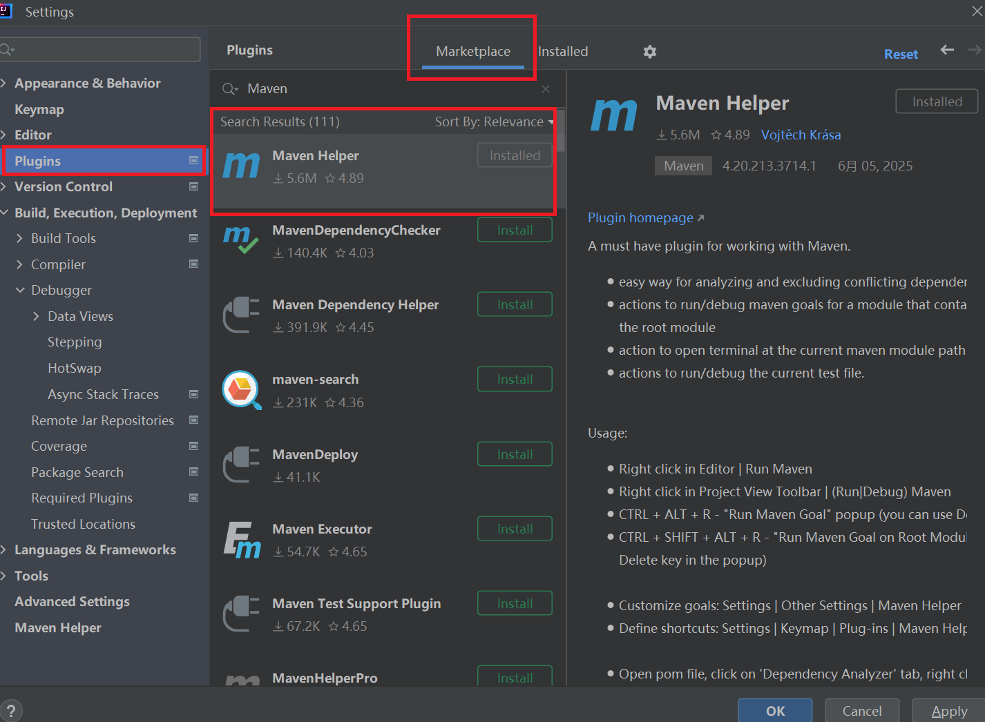 安装完以后,installed中将Maven Helper勾选上 Ok Apply需要重启idea