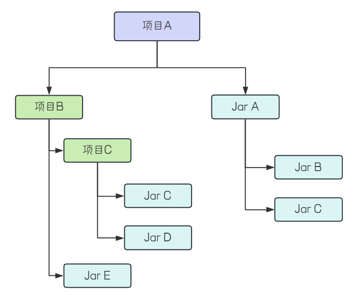 当然依赖虽然把所有需要的都打包进来,虽然很好,但是此时可能会出现这个项目依赖 Jar C ,这个也依赖Jar C,此时导入两次Jar C并且可能导入版本不一样因此出现冲突,此时可能不一定需要进行排包,需要具体情况具体分析