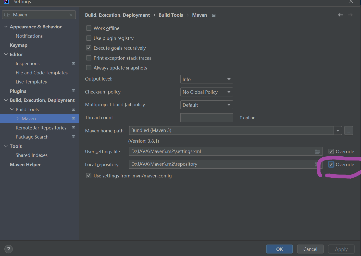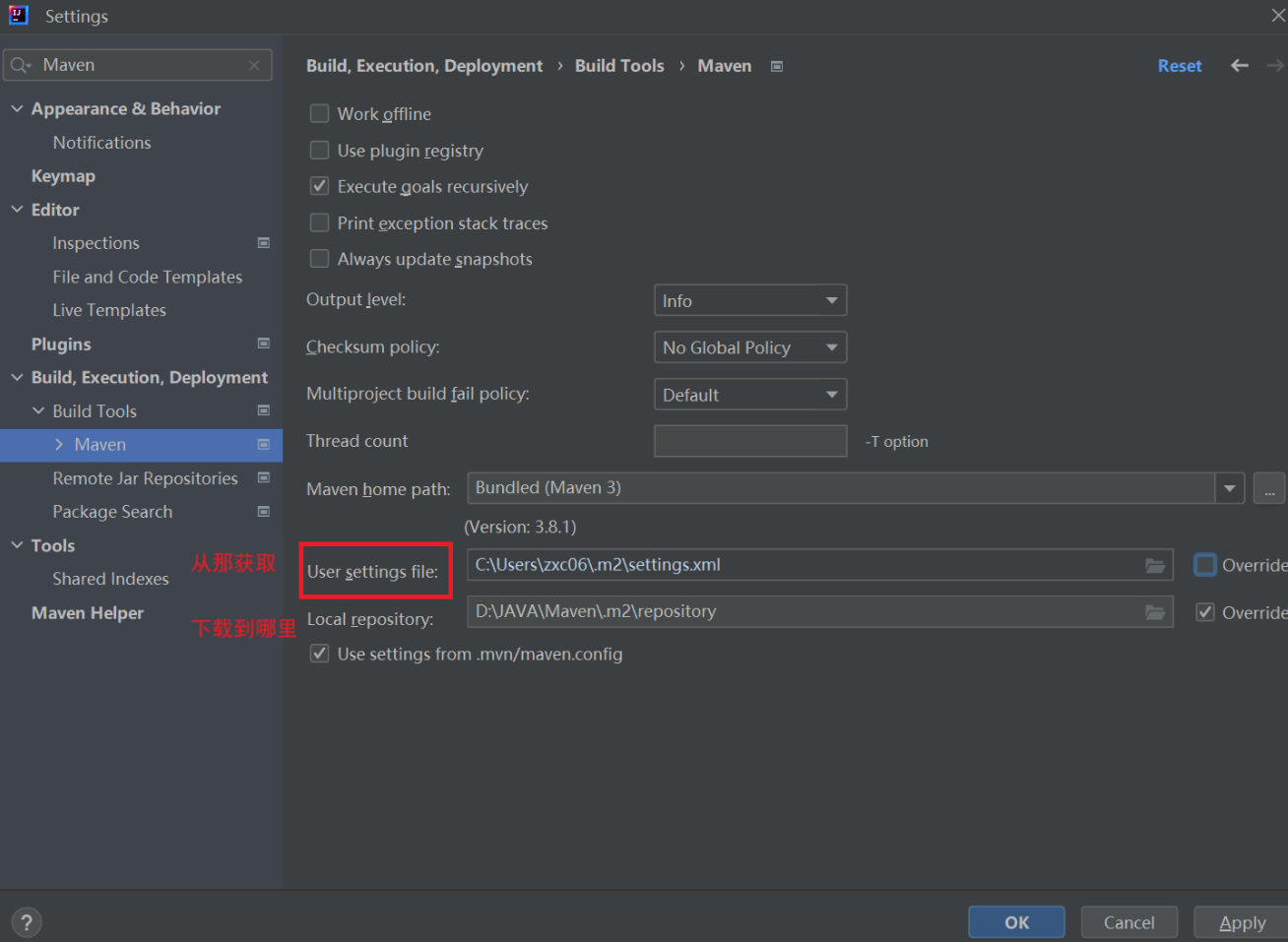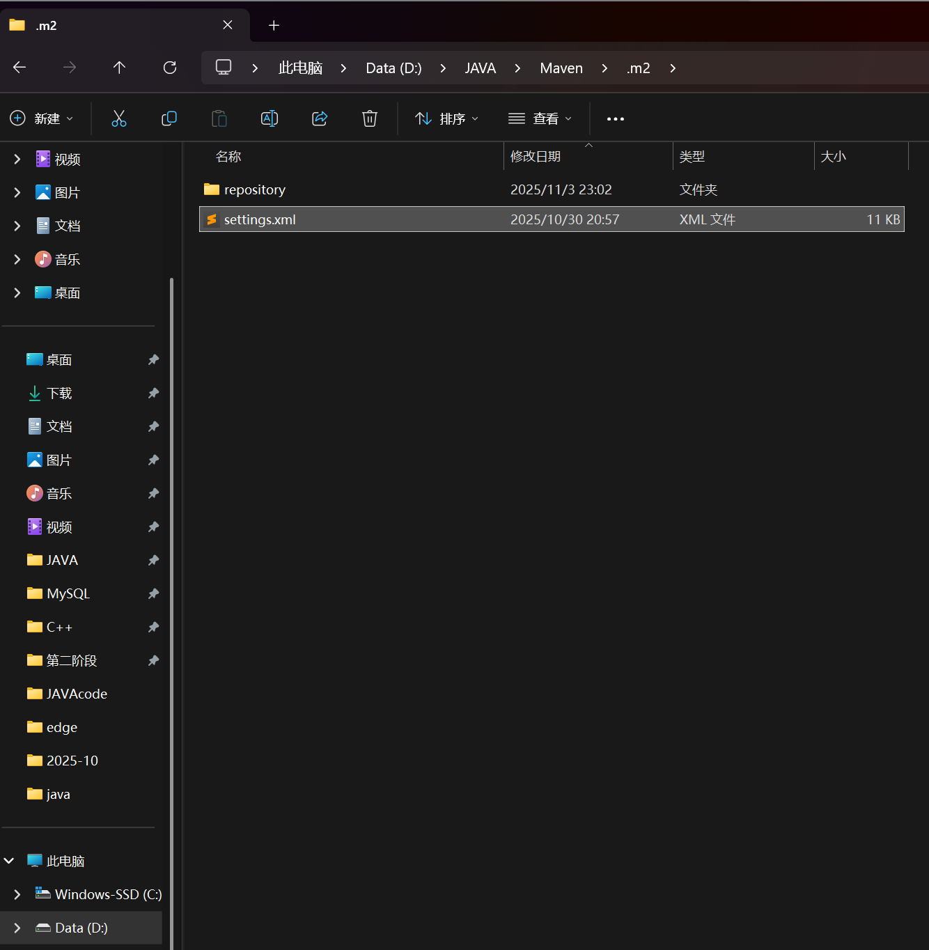 这里默认是在C盘中,因为未来可能会下载更多的文件,因此将其放入其他盘中,此时需要将这里.m2文件拷贝出来,放到其他盘文件中,最后将这个保存位置放到其他盘即可