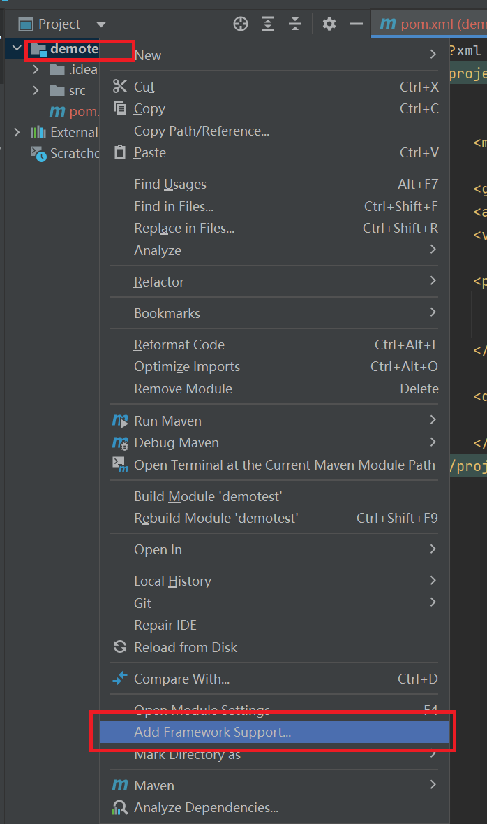 如果右边么有显示的话,右键点击我们这个项目,此时有个Add Framework Support,此时如果里面有Maven勾选上就行 ,此时就会显示了,如果没有Maven说明右侧显示了