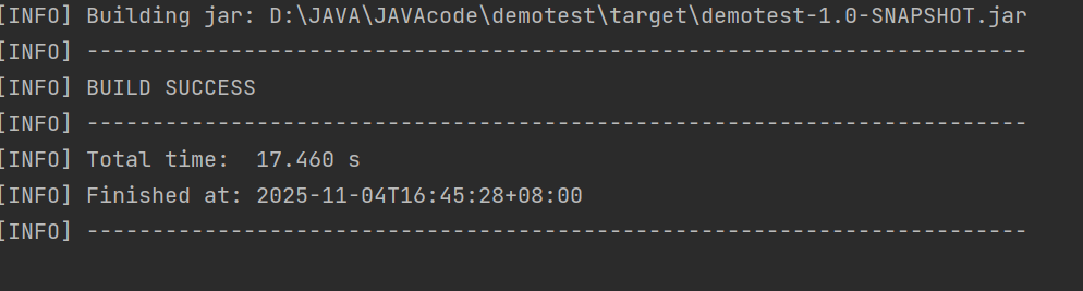 例如此时点击package打包 ,将其打包成jar包(普通java库) 或者 War包(Web应用),此处可以点击右侧Maven中package进行打包,也可以通过命令行通过命令行mvm package进行打包