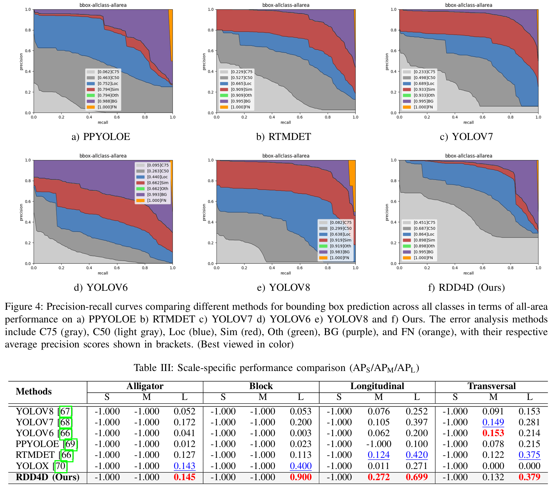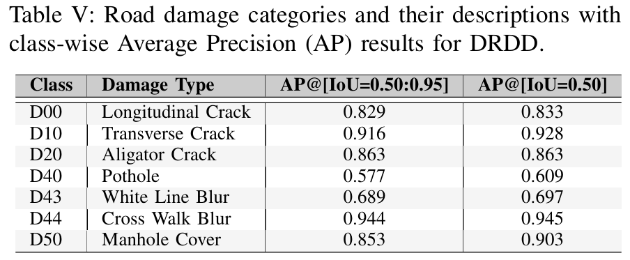 表II提供了每个类别的AP,表III展示了跨不同损伤类型的详细尺度特定分析。Alligator和Block裂缝以及Transversal裂缝中、小尺度的值为-1.000,表明我们的数据集中不存在这些尺度的变化。我们的方法在检测所有类别的大型尺度损伤方面表现出卓越的性能,在Alligator、Block、Longitudinal和Transversal裂缝上获得了最高的AP分数,分别为0.145、0.900、0.699和0.379。