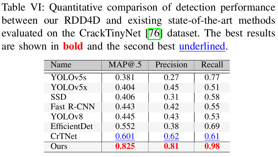 如表VI所示,我们提出的方法在CrackTinyNet[76]数据集上相比于现有方法有显著改进。该数据集将道路表面缺陷分为七个不同的类别:三种裂缝类型(纵向-D00、横向-D10和鳄鱼纹-D20)、表面变形(坑洞-D40)、两种标记劣化类型(白线模糊-D43和人行横道模糊-D44)以及基础设施元素(井盖-D50)。我们的模型以0.825的mAP@.5分数显著优于先前的最佳表现者CrTNet[76](0.601),在这项数据集上检测准确率提升了37%。与广泛使用的目标检测框架如YOLOv8[74](0.445)和EfficientDet[77](0.552)相比,这一改进尤为显著。我们的模型产生的误报检测更少,这对于实际应用至关重要,因为误报可能导致不必要的维护检查。像YOLOv5s [78]和SSD [79]这样的传统模型显示出相当低的精确率(分别为0.27和0.31)。也许最令人印象深刻的是,我们的模型达到了0.98的召回率,展示了其检测数据集中几乎所有道路损伤实例的能力。这相较于CrTNet的0.61召回率有显著提升,并且远远超过了其他基准模型,如Fast R-CNN [80](0.55)和YOLOv8(0.53)。