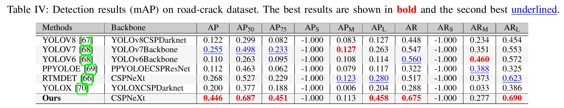 在召回率性能方面,YOLOV6在检测中型损伤方面表现出强大的能力,AR最高为0.460,其次是PPYOLOE的0.388。对于构成我们数据集主体的大型损伤,我们的方法获得了最佳的AR 0.690,RTMDET紧随其后为0.623。总体而言,我们提出的方法表现出优越的性能,在所有模型中获得了最高的AP、AP50和AP75分数,分别达到0.446、0.687和0.451,相较于表现次佳的RTMDET(AP=0.268,AP50=0.527,AP75=0.229\mathrm{A P}=0.268,\mathrm{A P}50=0.527,\mathrm{A P}75=0.229AP=0.268,AP50=0.527,AP75=0.229)有显著改进。这些结果验证了我们方法的有效性,特别是在检测占主导地位的大型道路损伤方面。