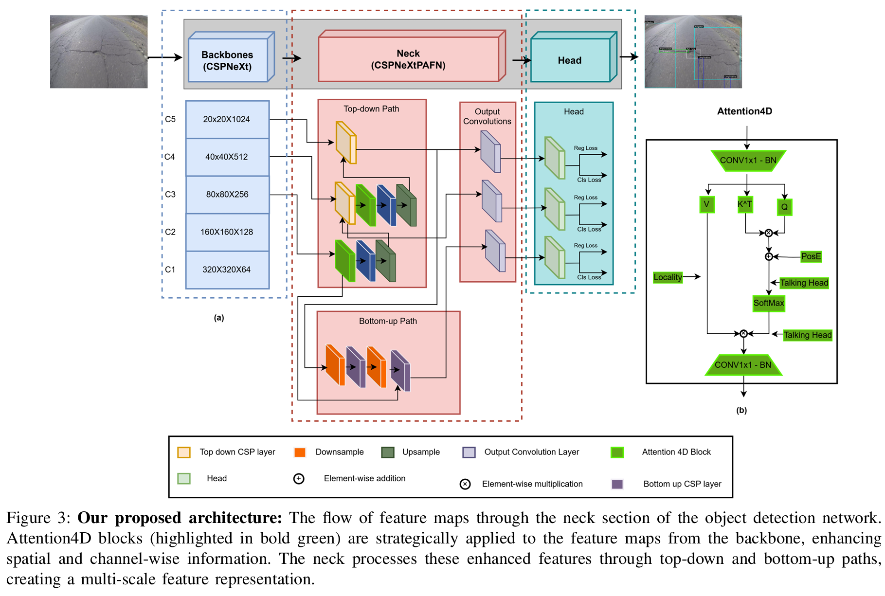 - 我们引入了一种用于道路损伤检测的4D注意力机制。这种增强使网络能够同时处理局部细节和全局上下文,从而更准确地检测不同尺度的道路损伤。