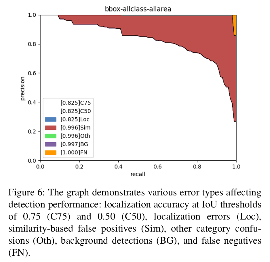 评估指标。为了评估我们目标检测器的性能,我们使用了COCO评估指标,这是评估目标检测和分割模型的标准指标。COCO评估框架提供了跨不同IoU阈值和基于不同对象大小(小、中、大)对模型性能的详细分析。