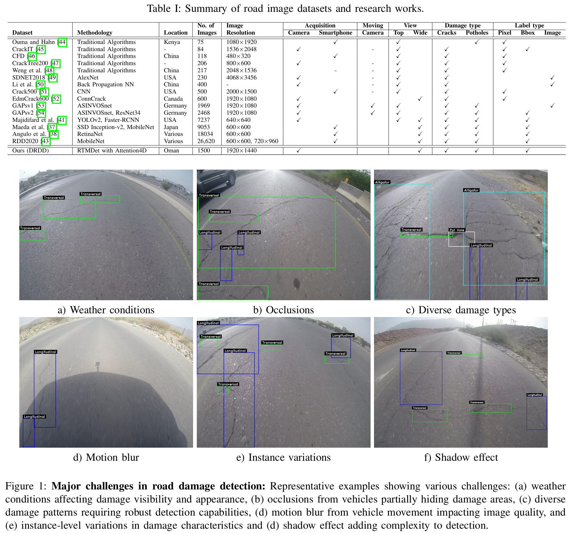 遮挡。DRDD在常规交通时段收集,以确保它们反映实际场景。然而,一个缺点是数据集中的图像存在遮挡。图1(b)展示了这种情况的一个例子,其中损伤类型部分被遮挡,由于可见特征有限,使得检测具有挑战性。根据遮挡情况,数据集可以测试技术在具有挑战性案例中的性能。