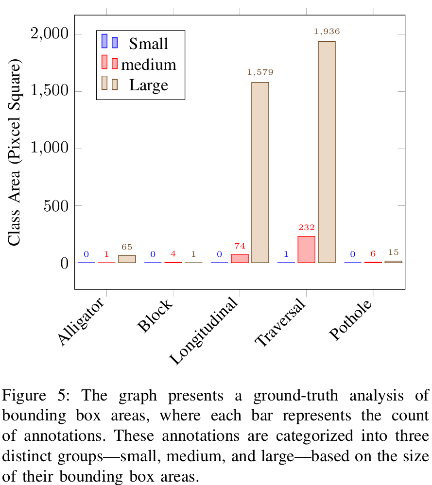 数据集 。道路裂缝数据集的视频是使用安装在汽车前部、对准道路表面的GoPro相机录制的。当车辆穿越各种道路时,它记录了在不同光照条件下的多种类型的裂缝,全面代表了不同的道路状况。土木工程师仔细审查并验证了每种道路状况,以准确识别和确认各种裂缝类型的存在。我们以MP4格式录制了30个视频片段,每个片段的分辨率为1920×1440像素,帧率为30fps。大多数视频片段持续20到30分钟。然后将这些视频转换为帧,并丢弃由于车速导致的模糊图像以保持质量。我们使用计算机视觉标注工具以Pascal-VOC和COCO格式标注图像。从视频片段中,我们共标注了1,500张图像。图5展示了数据集的分布。一些视频帧包含多达45个标注,显示了单帧内各种道路裂缝的复杂和杂乱性质。COCO指标根据边界框的面积将数据集中的对象分为三种大小。小对象占据少于32×3232\times3232×32像素的区域,中等对象在32×3232\times3232×32像素到96×9696\times9696×96像素之间,大对象超过96×9696\times9696×96像素。根据我们对真实标签的分析,如图5所示,大多数标注对象根据COCO指标被归类为大或中等。