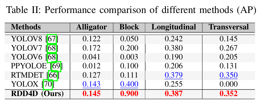 所有模型在小型损伤上的AP和AR分数为-1.000(APS\mathrm{A P_{S}}APS和ARS\mathrm{A R}_{S}ARS),这表明数据集中不存在小型损伤,而不是检测性能差。这一观察证实了我们数据集中的大多数道路损伤属于大型类别。对于中型损伤,YOLOv7获得了最高的AP 0.127,其次是RTMDET的0.123。在大型损伤类别中,我们数据集中的实例大多集中于此,我们的RDD4D方法以0.458的AP显著优于其他方法,而RTMDET以0.280的AP位居第二。