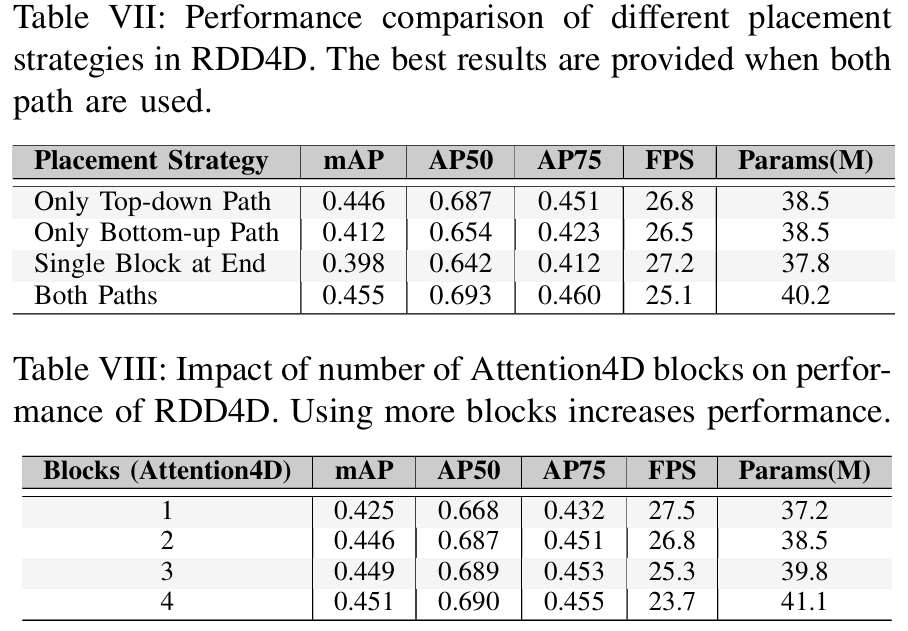 表VII所示的关于Attention4D块放置策略的消融研究表明,在自上而下路径中使用块能产生更优的性能(mAP=0.446\mathrm{mAP}=0.446mAP=0.446,AP50=0.687,AP75=0.451\mathrm{A P}50=0.687,\quad\mathrm{A P}75=0.451AP50=0.687,AP75=0.451),相比于自下而上路径(mAP=0.412\mathrm{mAP}=0.412mAP=0.412)或单个块放置(mAP=0.398\mathrm{mAP}=0.398mAP=0.398)。虽然在两个路径中都实施块能略微提高性能(mAP=0.455\mathrm{mAP}=0.455mAP=0.455),但这是以降低推理速度(25.1 FPS 对比 26.8 FPS)和增加参数数量(40.2M 对比 38.5M)为代价的。这表明,在自上而下路径中放置块在检测精度和计算效率之间提供了最佳平衡。表VIII对Attention4D块数量的进一步分析显示了一个清晰的性能趋势。虽然单个块显示出适度的结果(mAP=0.425\mathrm{mAP}=0.425mAP=0.425),但实施两个块能显著提高性能(mAP=0.446\mathrm{mAP}=0.446mAP=0.446),同时参数增加1.3M,这是合理的。尽管添加三个或四个块能略微提高准确率(分别为mAP=0.449\mathrm{mAP}=0.449mAP=0.449和0.451),但计算开销变得相当大,将FPS分别降低到25.3和23.7,同时将参数数量增加到39.8M和41.1M。这些结果验证了我们选择在自上而下路径中使用两个Attention4D块作为最优配置,提供了检测精度和计算效率之间的最佳折衷。