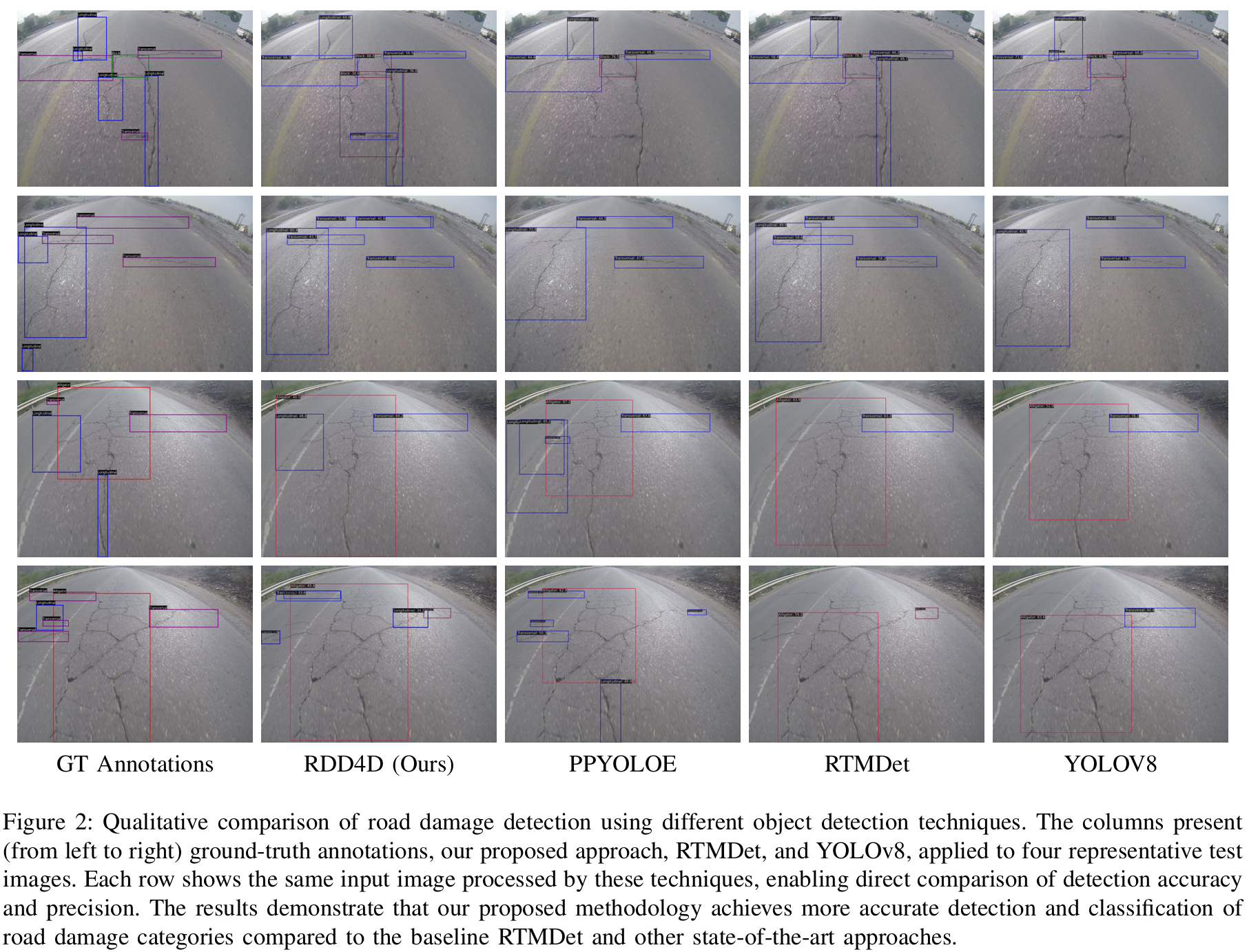 - 我们提出了一个新的、具有挑战性的道路损伤检测数据集,该数据集捕获了单张图像中不同条件下的多种损伤类型,弥补了现有数据集的一个重要空白。该数据集能够更稳健地训练和评估检测模型。
