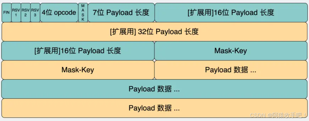 - 无头部冗余:帧头仅2~10字节(包含操作码、长度、掩码等),远小于HTTP头部,且掩码仅客户端需添加(服务端无需),提升传输效率。