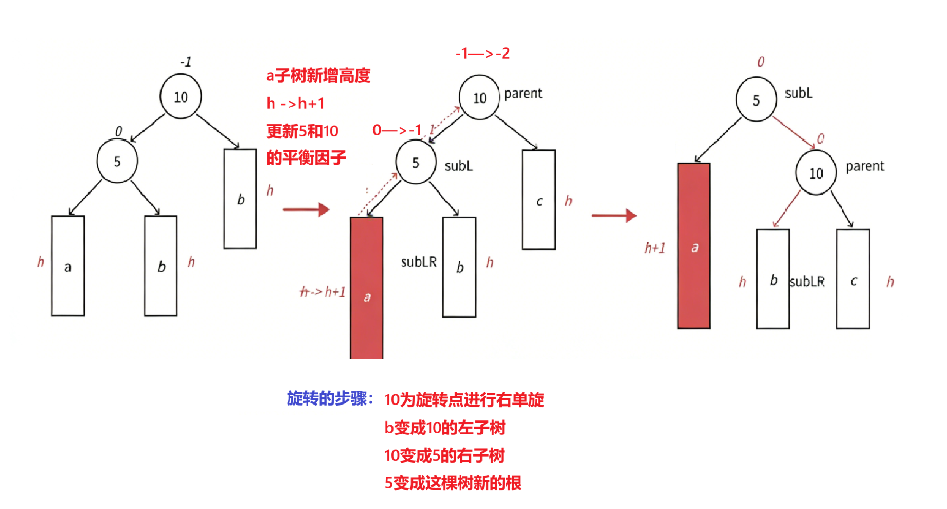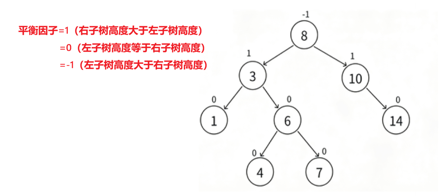 - 平衡因子=右子树高度-左子树高度