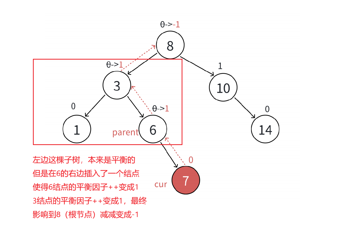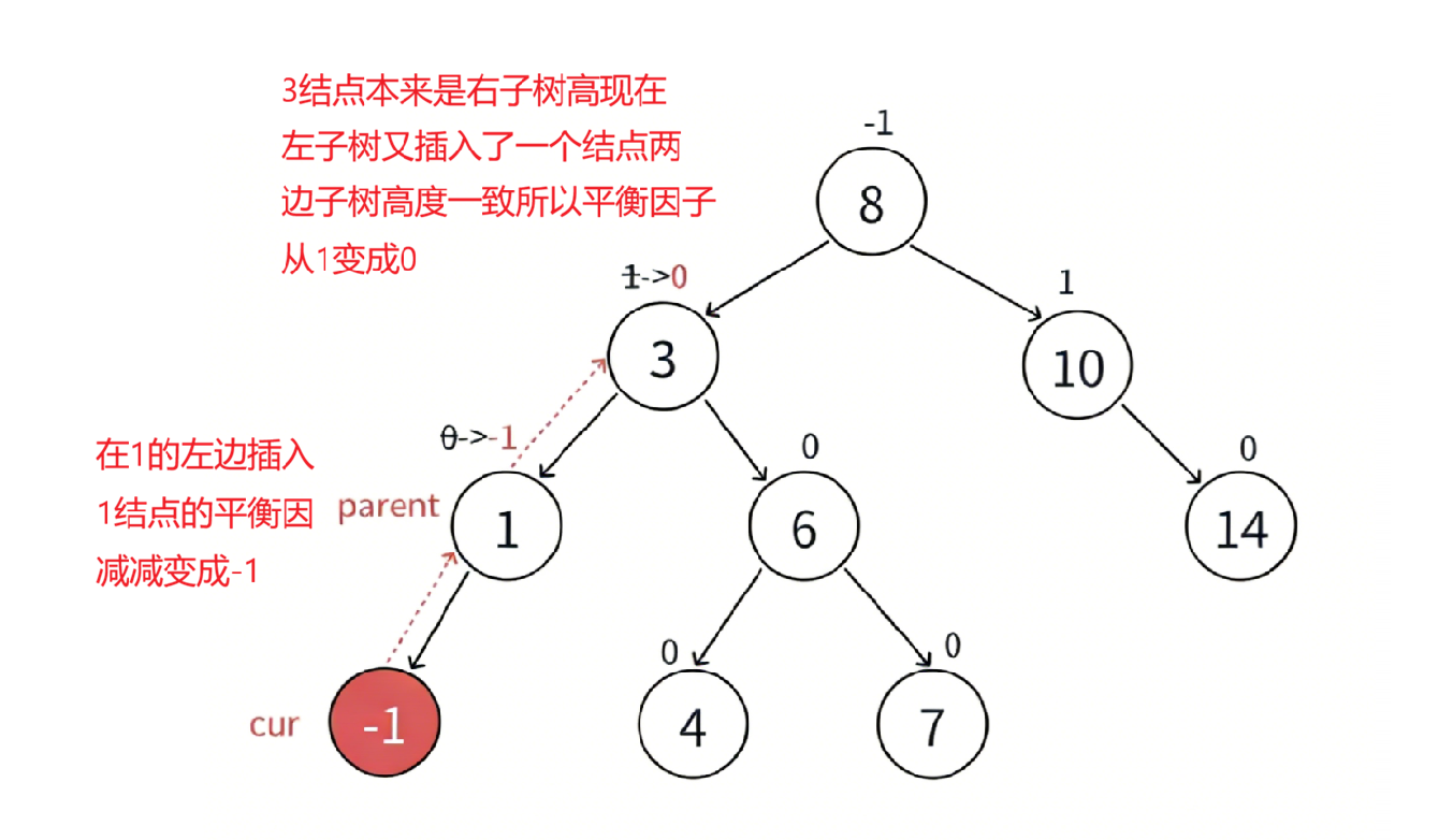 因为插入一个结点影响的是一整棵子树使得根节点8的左子树增加或者右子树增加,而更不更新平衡因子是要看该结点的平衡因子在变化之后是否是处于-1/0/1的平衡状态,如果不是就要旋转调整,如果是就要往上更新,直到要更新的那个结点变成0说明平衡才停止更新。