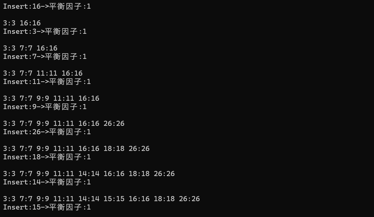 cout << "Insert:" << e << "->" <<"平衡因子:" << t.IsBalanceTree() << endl;